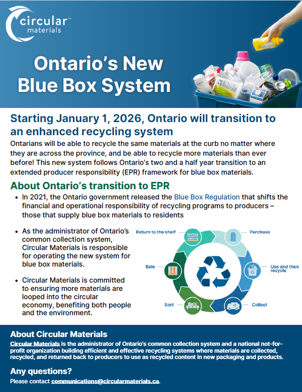 Further details will be provided in the coming weeks via Circular Materials who is the new administrator of Ontario’s common collection system. They are a national not-for-profit organization will be...