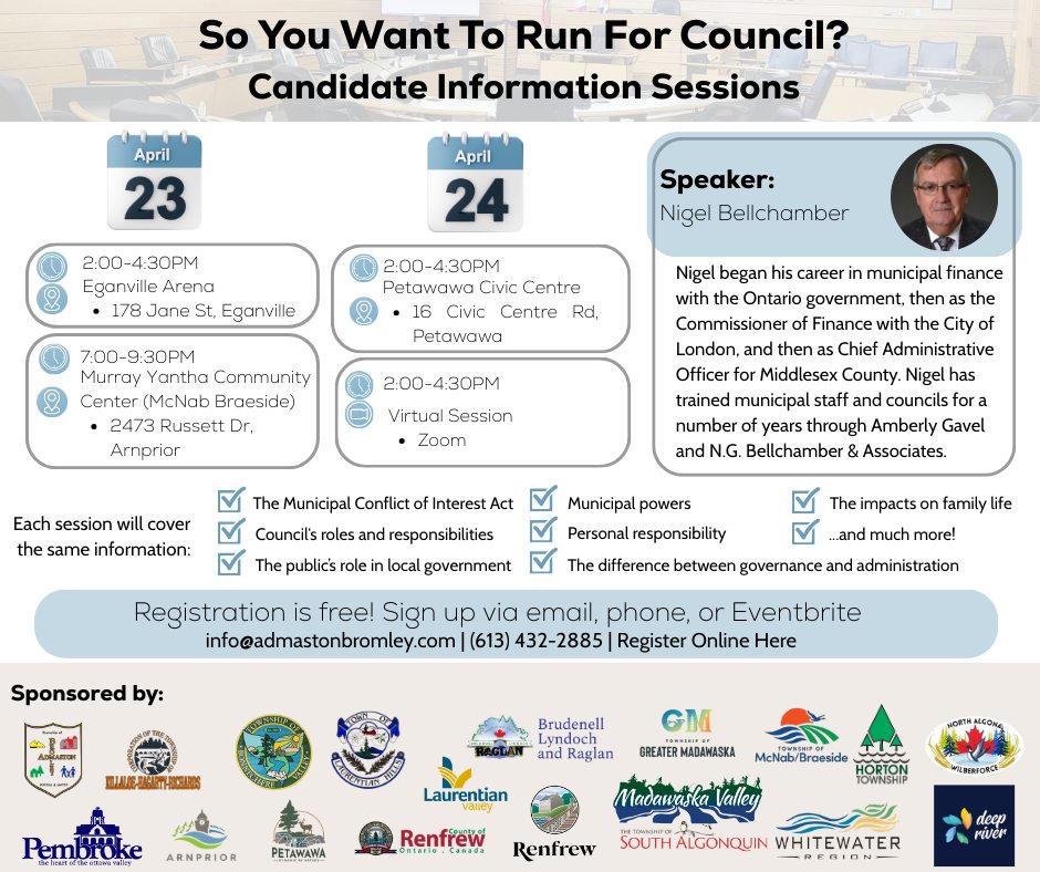 So You Want to Run For Council: Candidate Information SessionsLearn more about municipal powers, roles and responsibilities, the impact on family life, and more at these workshops! Three to choose from, including a virtual option. This municipally-sponsored event is free to attend.