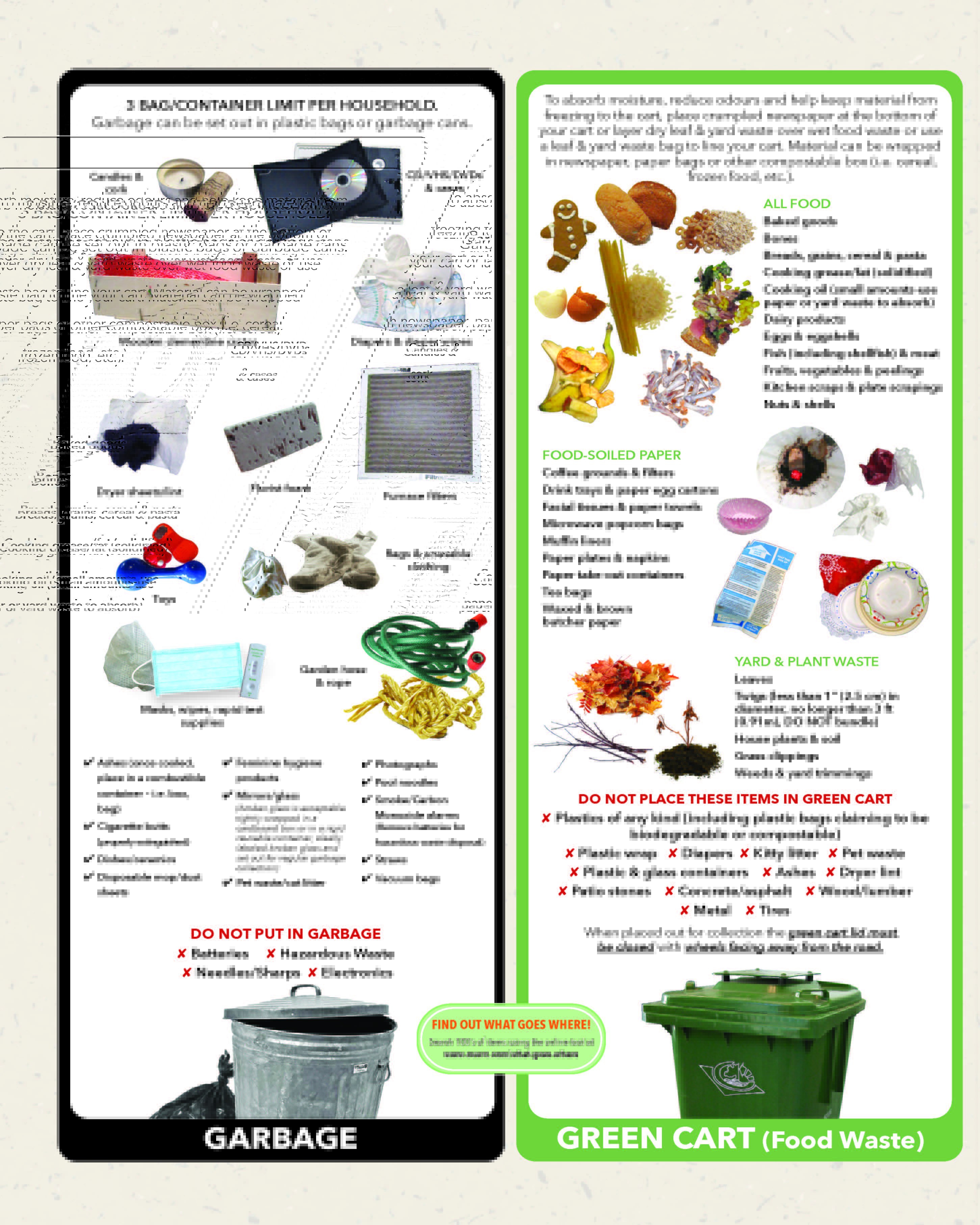 NO PLASTICS: Plastics of any kind including compostable and biodegradable plastic are NOT acceptable in the green cart.