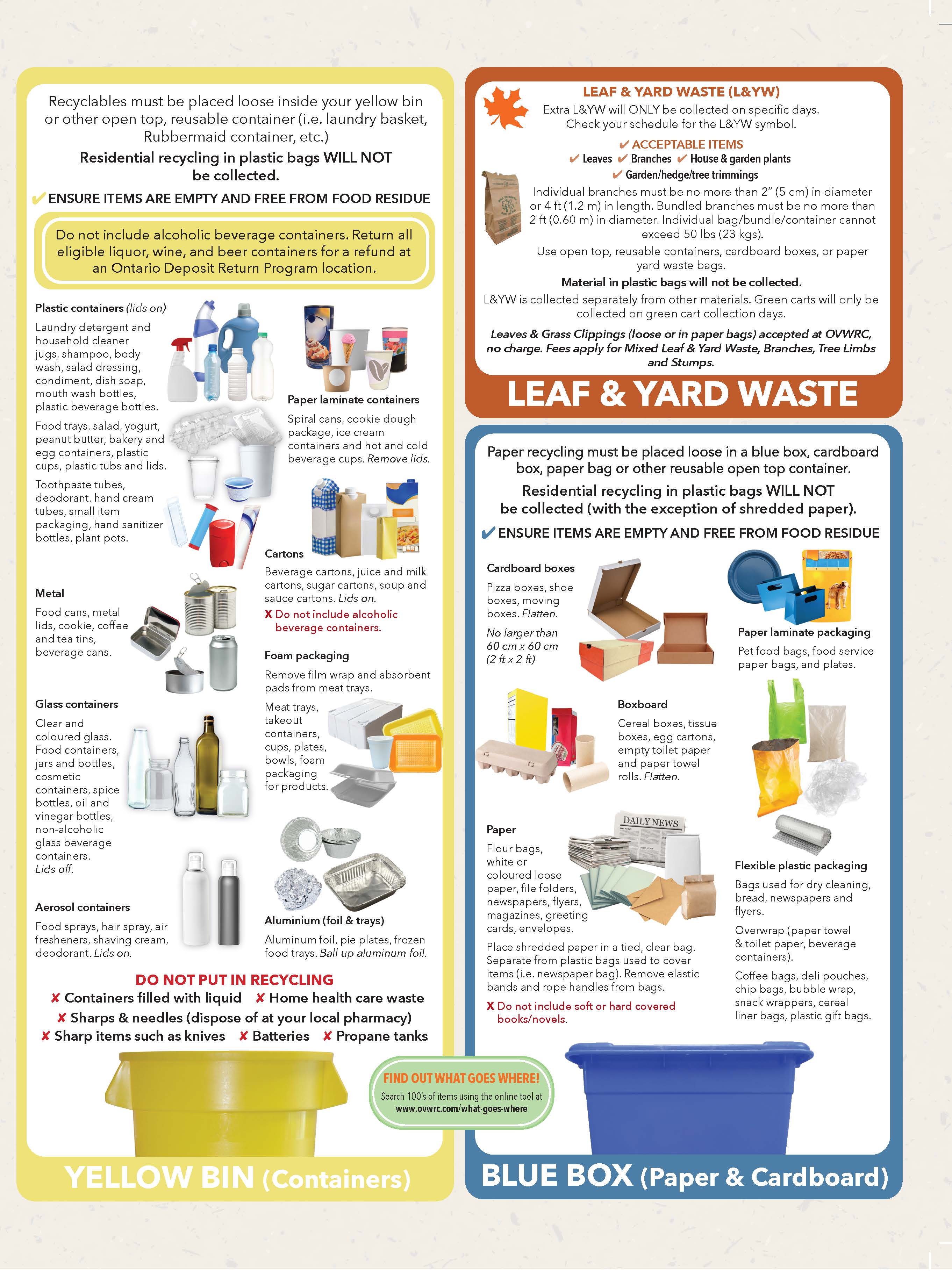 Plastics, glass and metal must be placed loose inside your yellow bin. Rinse containers and remove all lids. Extra recycling can be placed inside an open top, reusable container beside your yellow bin (i.e laundry basket, Rubbermaid container, etc.). Recycling in plastic bags will not be collected.